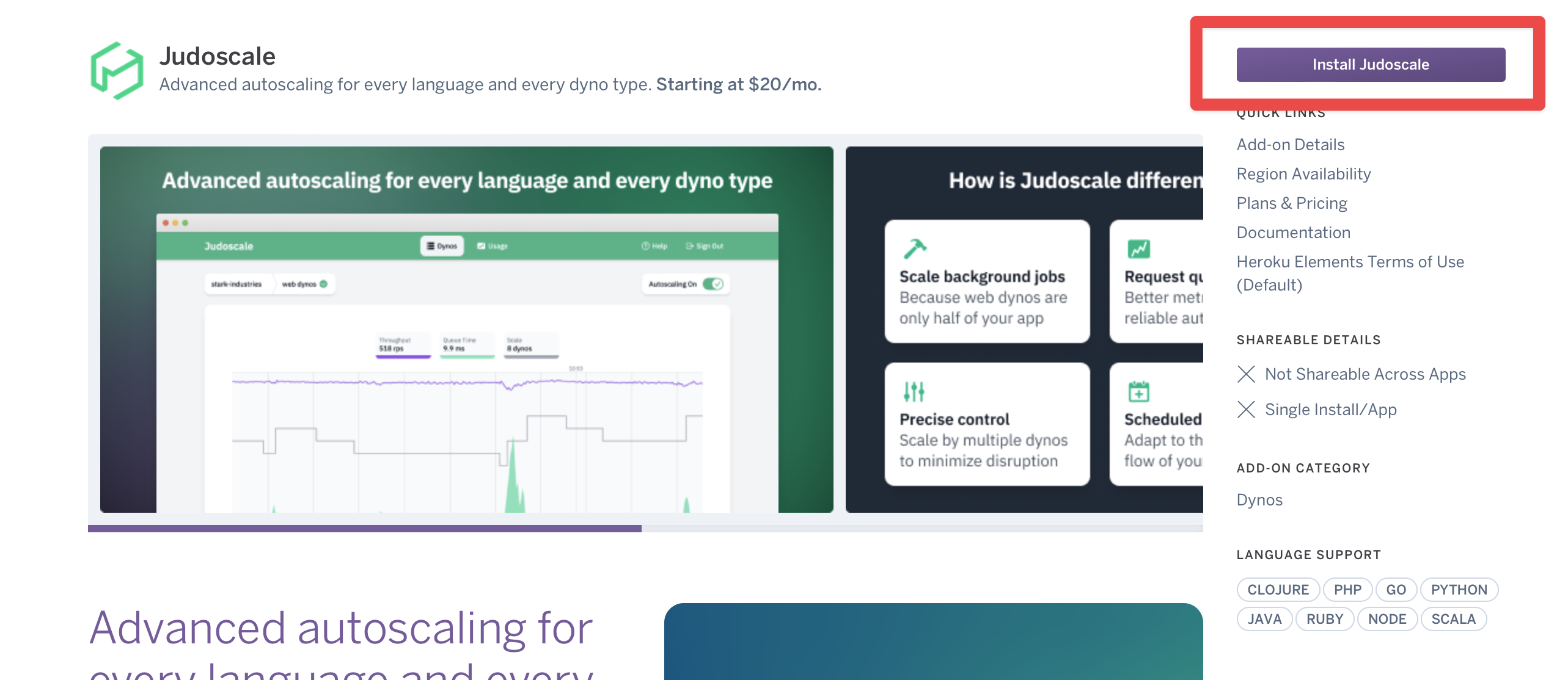 Heroku Elements is Heroku’s marketplace for add-ons, buildpacks, and buttons. Like every other add-on, Judoscale has a dedicated Heroku Elements page with details and pricing information.