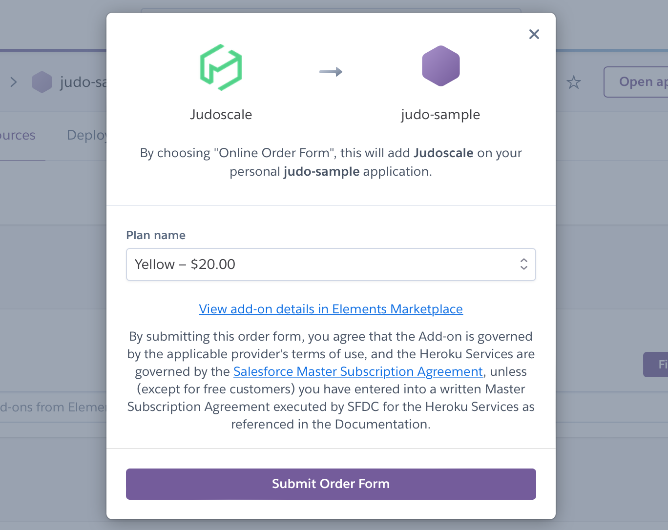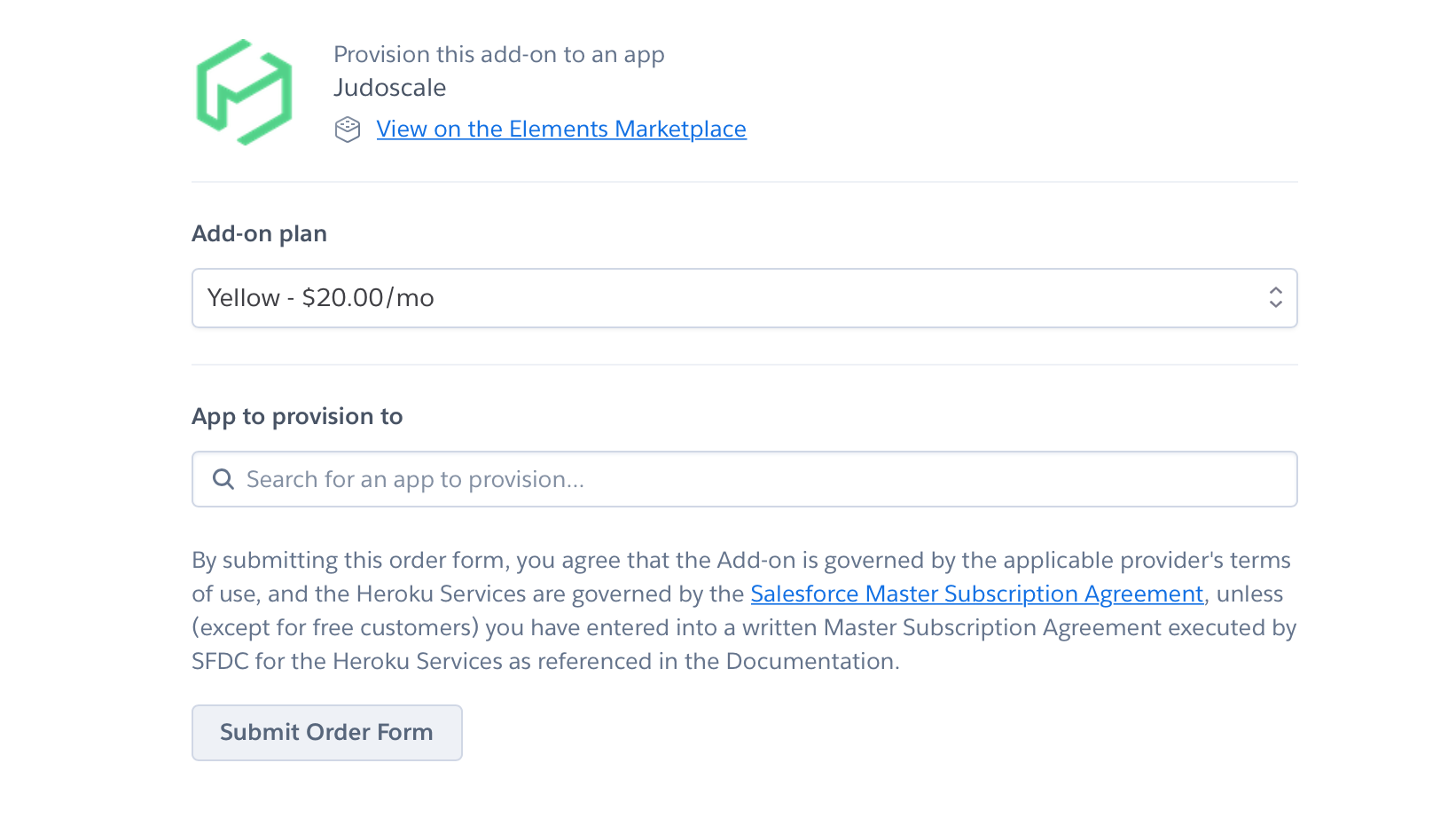 On the next screen, you will choose your Judoscale plan, the Heroku application where you want to install it, and click “Submit Order Form”.