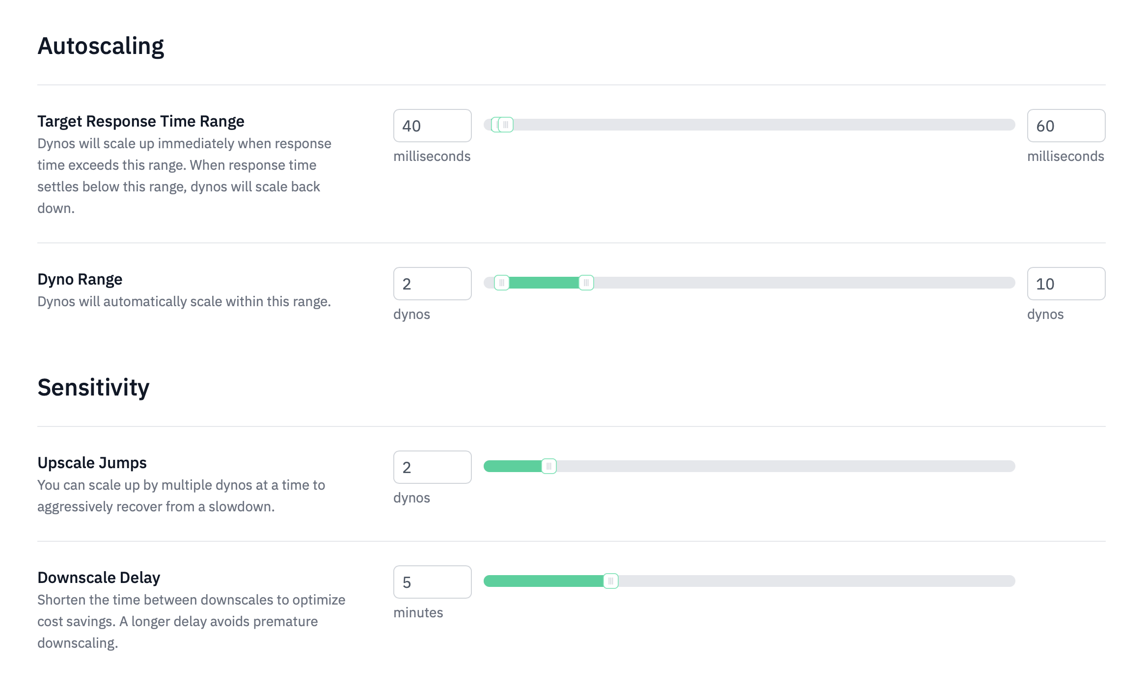 In addition to your response time range (or queue time range if you’ve installed an adapter), you can configure your dyno range, upscale jumps, and downscale delay.